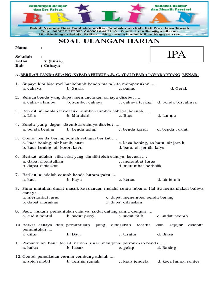 Soal Ipa Kelas 5 Sd Bab Cahaya Dan Kunci Jawaban Bimbel Brilian