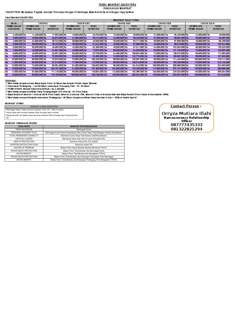 Adapun opsi produknya terbagi menjadi tiga kategori yakni Davestra dan Davestra Optima. Bank Rakyat Indonesia Persero Tbk. Berbeda dengan kakak tuanya yang memiliki nama mirip diatas produk ini adalah asuransi dwiguna standar yang tidak memiliki keistimewaan khusus bahkan unit link nya pun tergolong biasa-biasa saja.