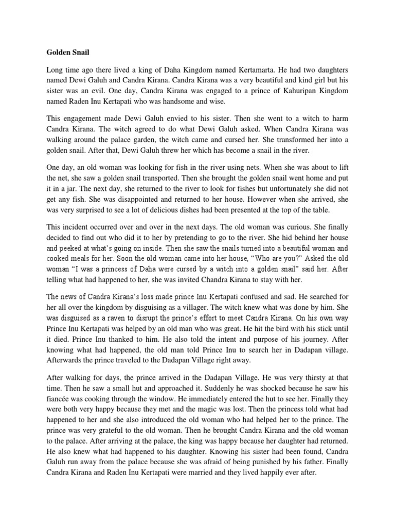 Culture art and food all of. Golden snail narrative text. Prince Raden Putras father was the king of the kingdom.