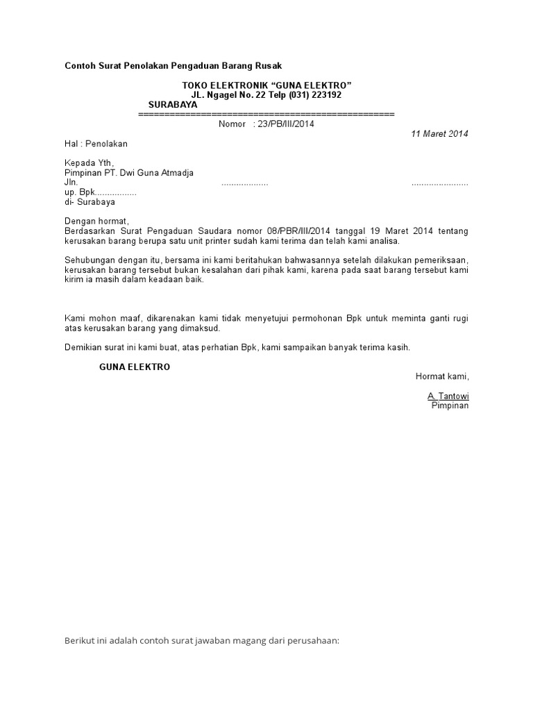 Contoh Surat Penolakan Pengaduan Barang Rusak