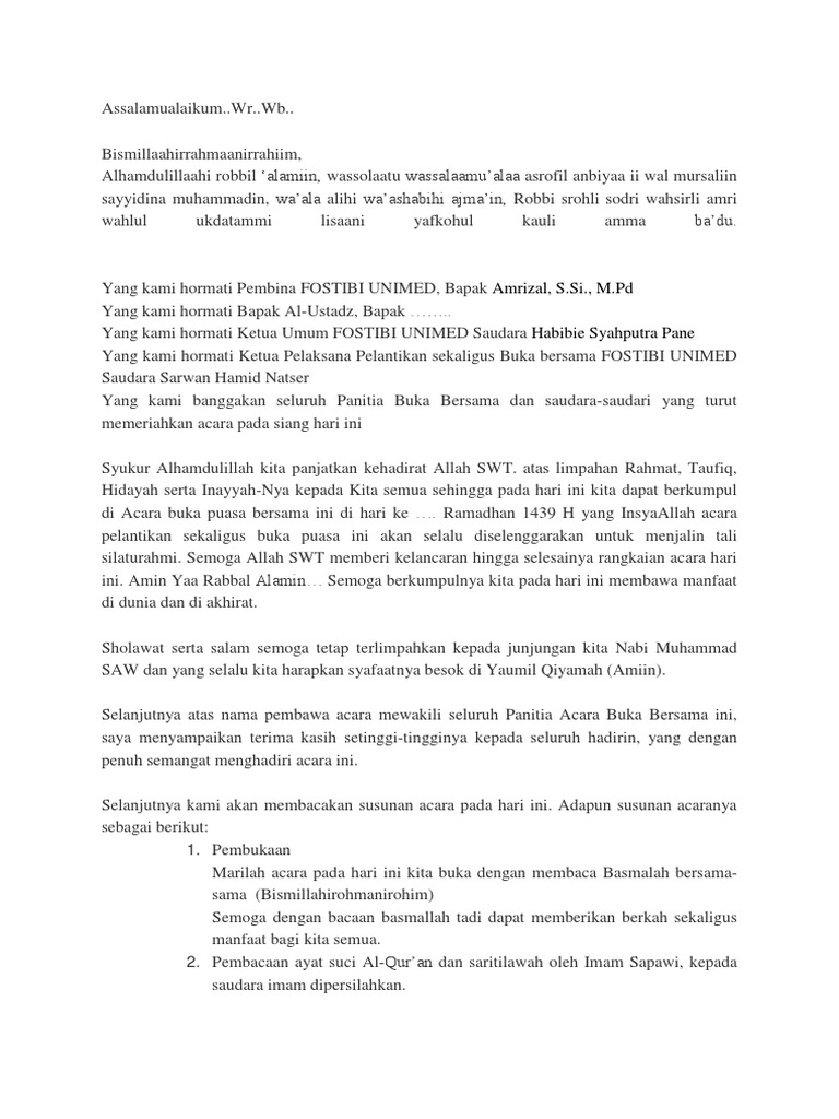 Kegiatan ini biasanya diadakan oleh perusahaan intansi pemerintahan komunitas atau organisasi. Bagi sahabat yang sedang mencari contoh teks MC atau pembawa acara Bukber bisa melihat pada postingan ini. Bismillaahirrahmaanirrahiim Alhamdulillaahi robbil alamiin wassolaatu wassalaamualaa asrofil anbiyaa ii wal mursaliin sayyidina muhammadin waala alihi waashabihi ajmain Robbi srohli sodri wahsirli amri wahlul ukdatammi lisaani.