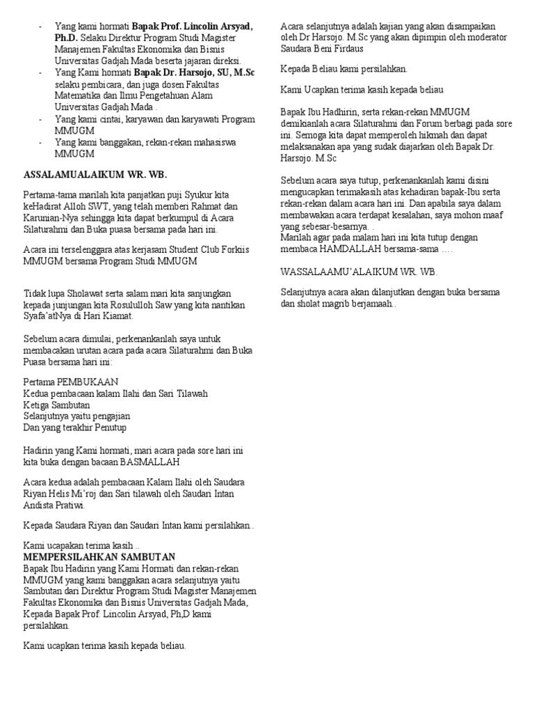Yang terhormat Bpk Bupati Sumba Barat BpkIbu Kepala Kantor Dinas Badan Bpk Ibu Tokoh Agama dan Alim ulama serta Bpkibu tamu undangan sekalian. Go to the sample. Begitu yang dapat admin bagikan mengenai teks mc acara buka puasa bersama.
