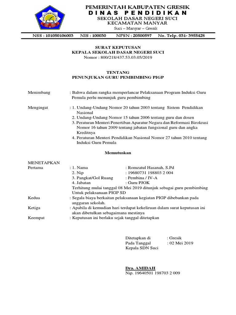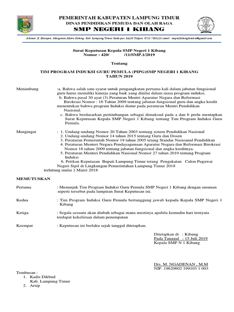Program Induksi Guru Pemula dapat juga dilaksanakan sebagai Program Induksi Guru Pemula Berbasis Sekolah karena itu pelaksanaan yang baik haruslah sistematis dan terencana berdasarkan konsep kerjasama dan kemitraan diantara para guru dalam pendekatan pembelajaran profesionalInduksi merupakan proses pembelajaran professional yang berlangsung. PIGP atau Program Induksi Guru Pemula diberlakukan bagi Guru yang baru saja di angkat menjadi Aparatur Sipil Negara CPNS PNS yang belum mempunyai pengalaman dalam mengajar baik itu di SD SMP SMA dan SMK. Contoh Sk Tim Akreditasi Sekolah Madrasah 2019 Arsip Guru.