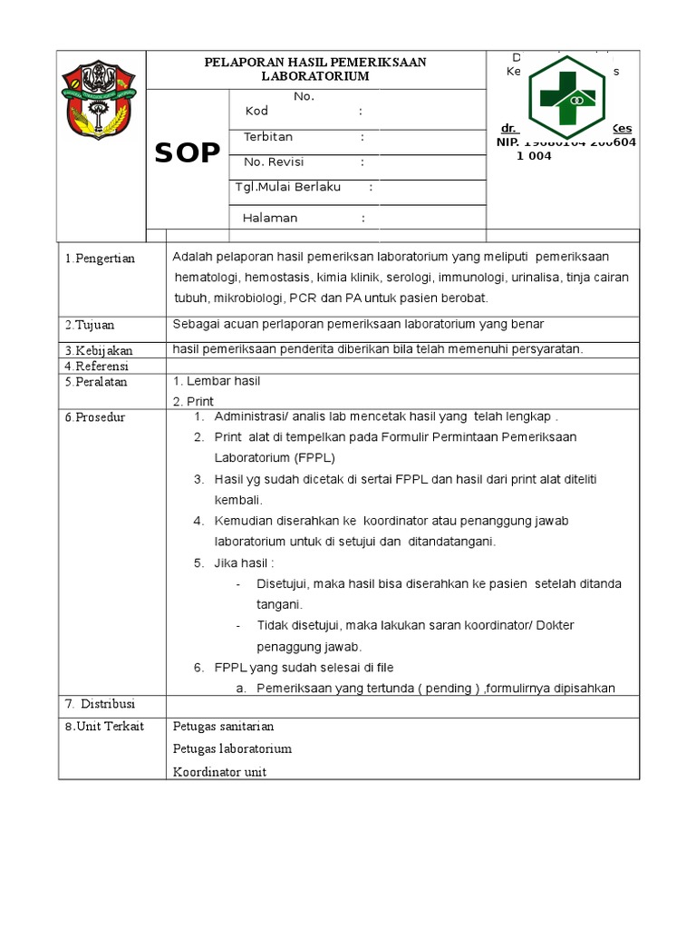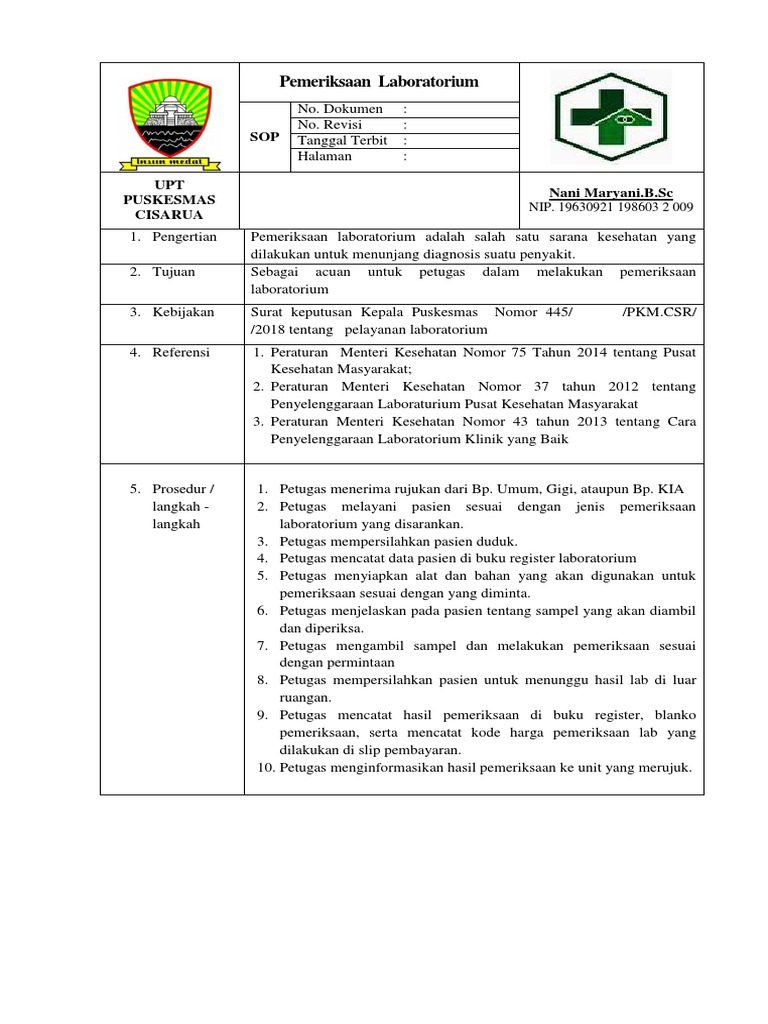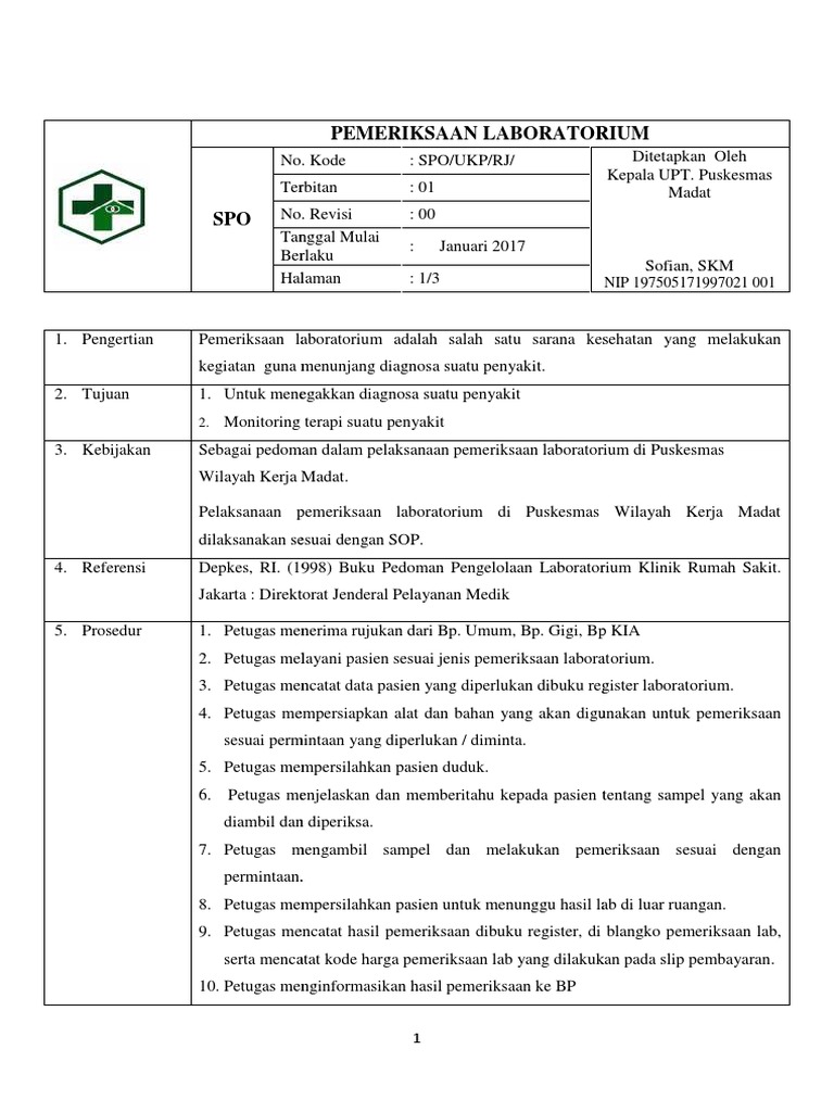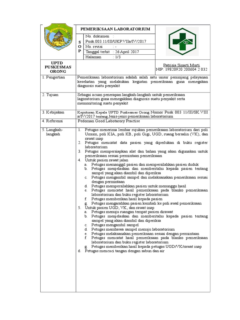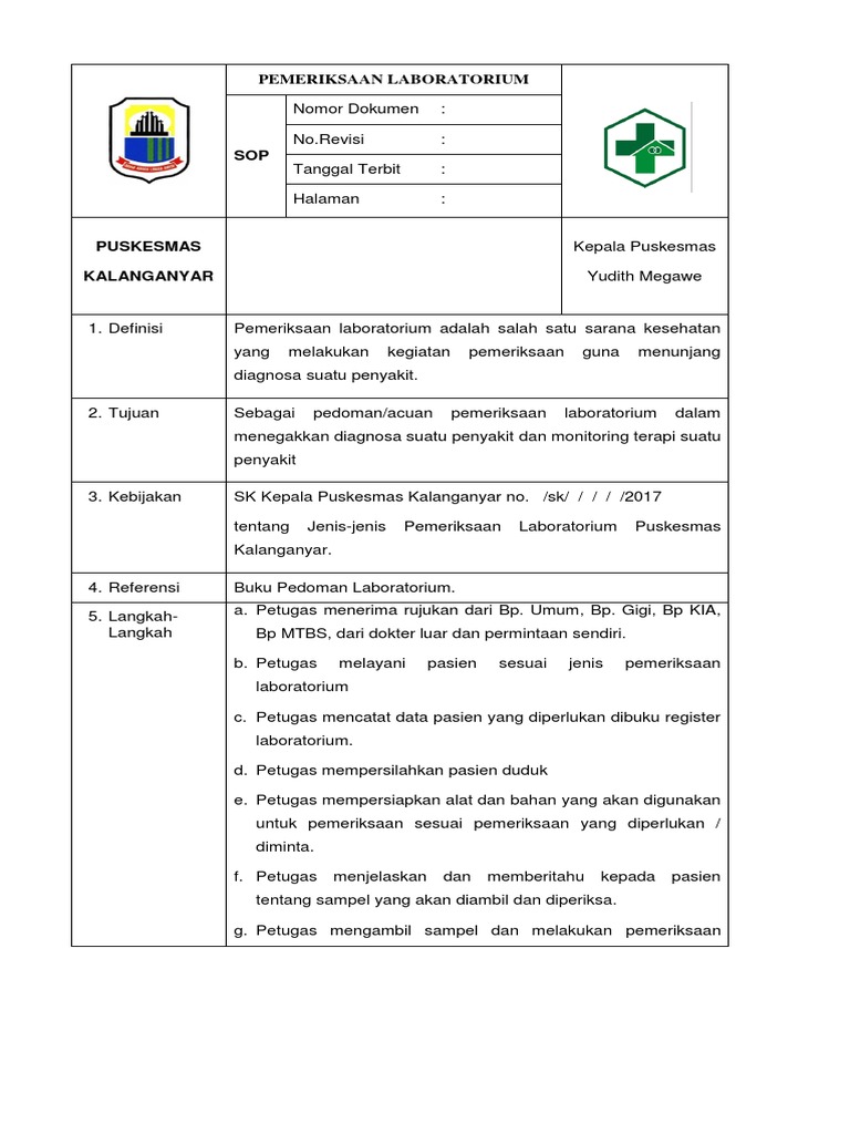 Report 8 1 1 1 sop permintaan pemeriksaan laboratorium please fill this form we will try to respond as soon as possible. 13 Ditetapkan Kepala UPT Puskesmas Manahan dr. Lilinmalamsabun Cara kerja.