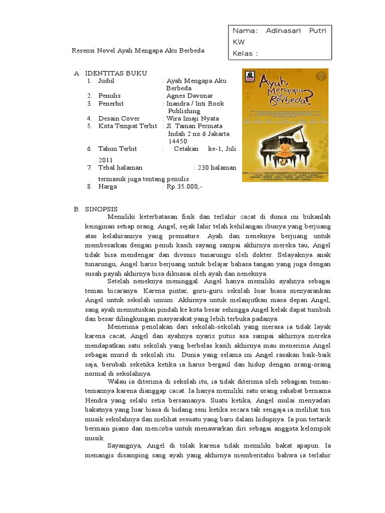 Di dunia maya karya Agnes ini dibaca hampir 2 juta orang. Resensi Ayah Mengapa Aku Berbeda. Sebuah novel yang bejudul Ayah Mengapa Aku Berbeda yang ditulis oleh Agnes Davanor berukuran 13X19 cm dengan tebal 320 halaman dan diterbitkan oleh penerbit Inandira Published Jakata yang bernomor ISBN.